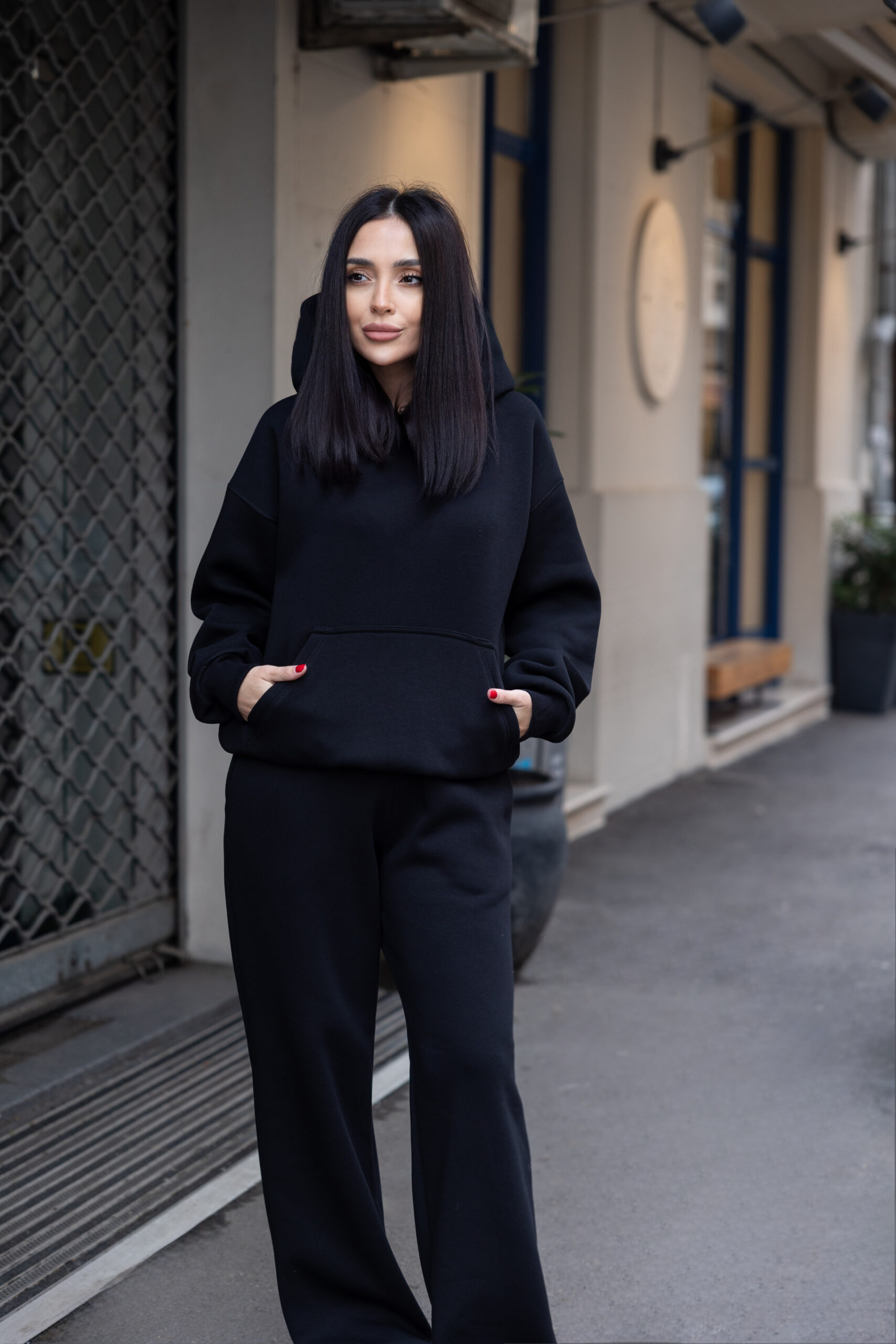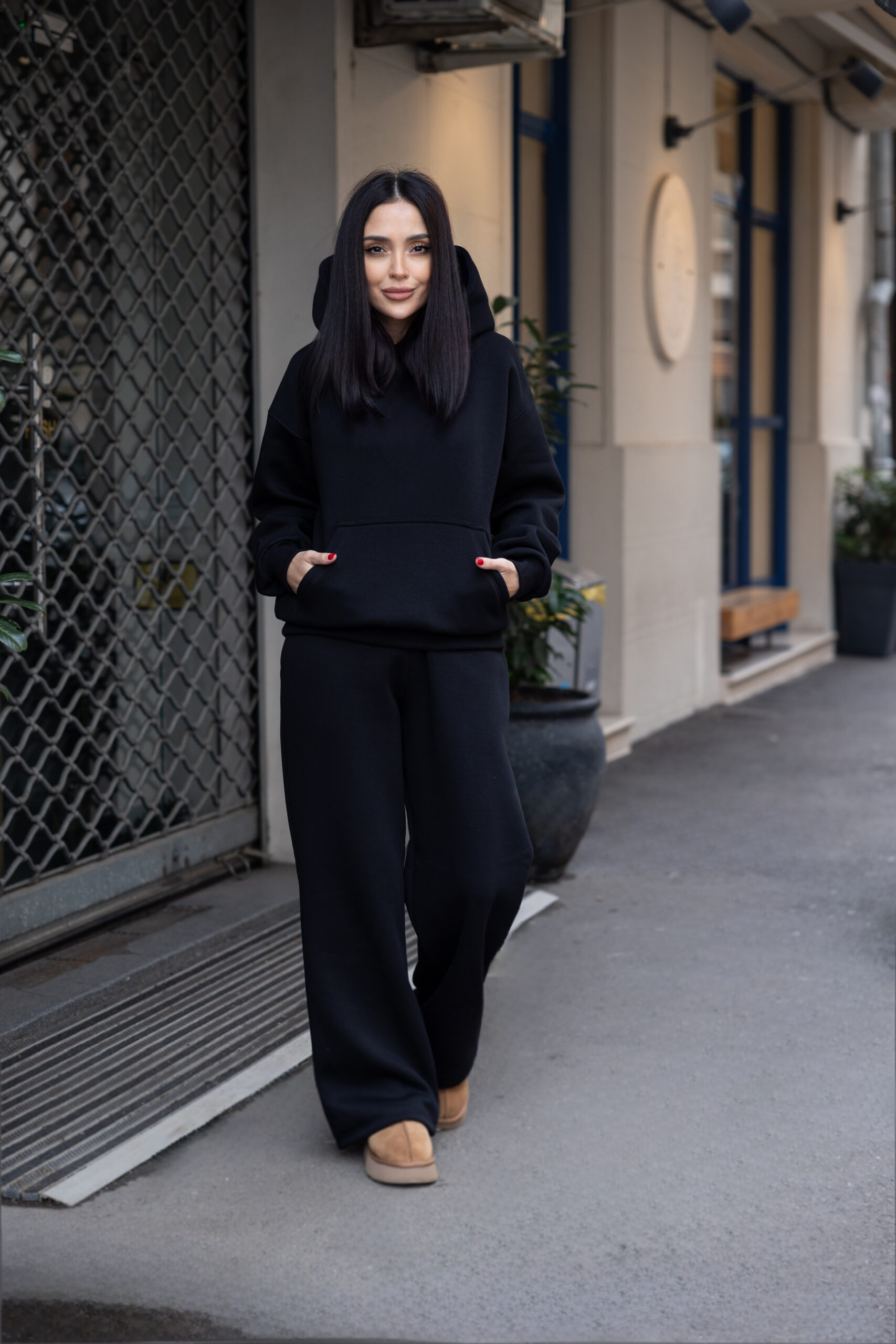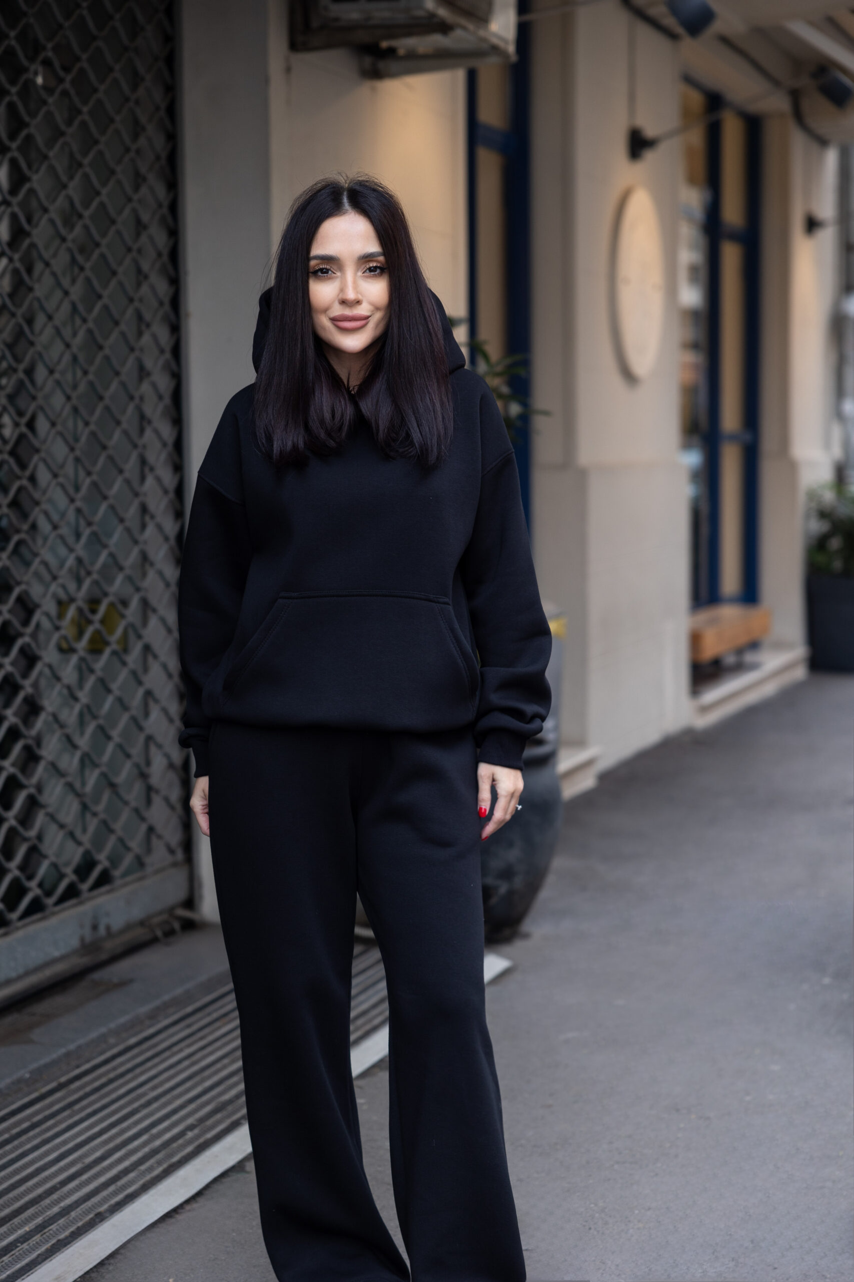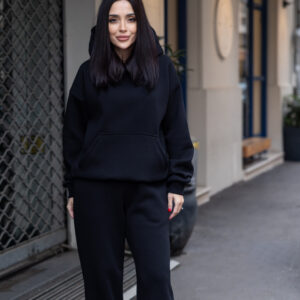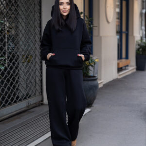 Bluza tip hoodie și pantalonii au o structură bine definită, care păstrează forma și aspectul impecabil chiar și după purtări repetate. Realizat integral în atelierul nostru, setul reflectă atenția la detalii, calitatea materialelor și standardele noastre de producție.